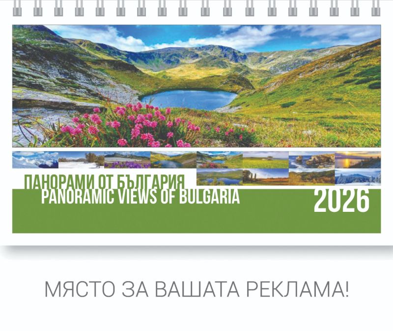 Тяло: 16 х 10 cm, 12 листа (месеца) двустранен хром гланц, цветност: 4+0. Отбелязани празници и имени дни, седмици. Подложка: 16 x 13.8 cm, 300 g/m2 бял опаковъчен картон Захващане: със спирала Рекламна площ върху основата: 16 x 3.5 cm