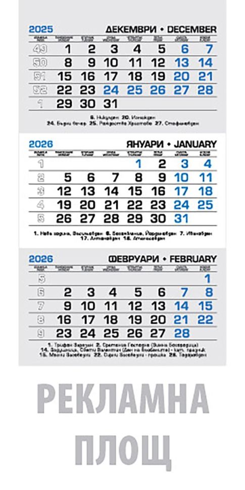 Начало Продукти за реклама Стенни и настолни календари Работен календар-пирамида, 12 листа, спирала, синя