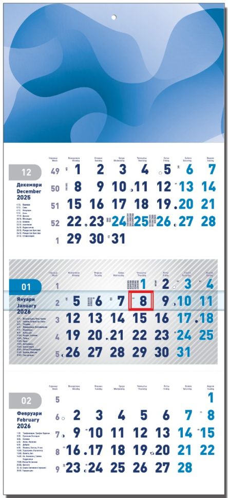 Начало Продукти за реклама Стенни и настолни календари Стенен работен календар Шайн 3-секц, син