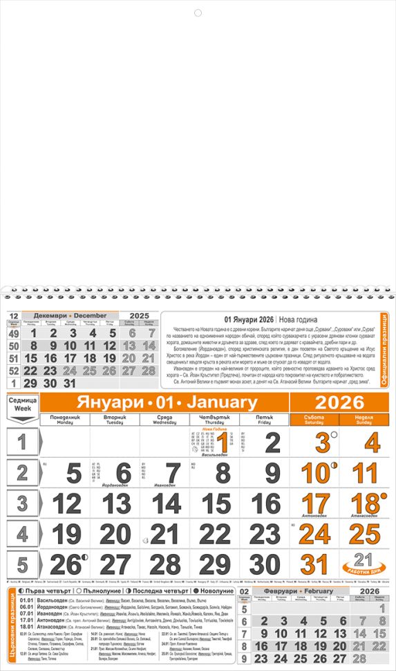 Стенен работен календар КС 1, 1секц оранж/чер, с ивица