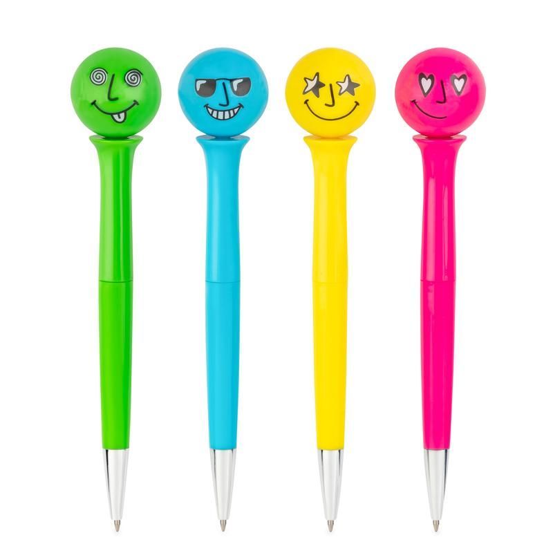 Химикалка с въртяща се фигурка. Натиснете смешното лице и то ще продължи да се върти около собствената си ос. Предлага се в 4 различни цвята: син, зелен, жълт, розов.