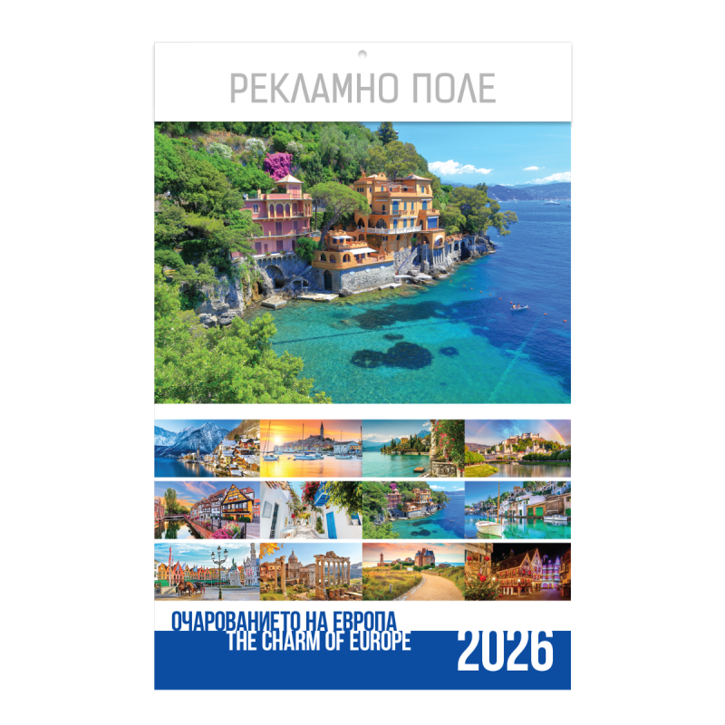 Сгънат формат: 31.4 х 44.2 cm Тяло: 12 листа (месеца), двустранен хром гланц. Отбелязани официални и църковни празници Корица: картон 350 g/m2 Щанцована дупка за окачване Рекламна площ 31.4 х 6 cm върху отварящ се картон