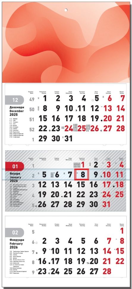 Начало Продукти за реклама Стенни и настолни календари Стенен работен календар Шайн 3-секц, червен