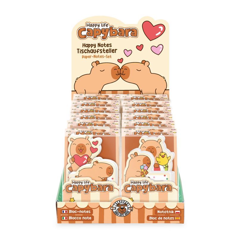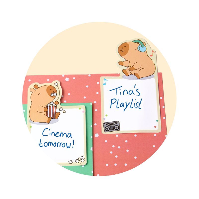 Самозалепващи листчета на капибара. Съдържат по 45 листa. Размери, включително опаковката: 6,5 cm x 3,5 cm x 10,5 cm.