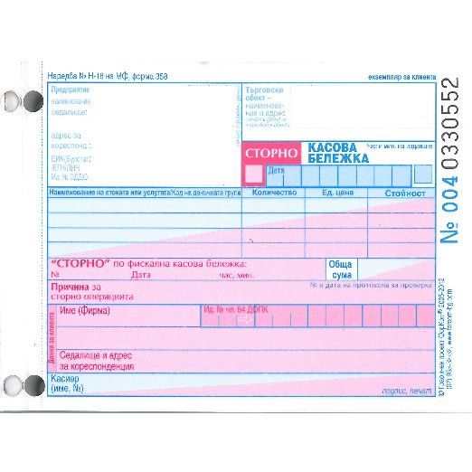 * Сторно касова бележка, номерация, химизирана, 50 x 2 л.