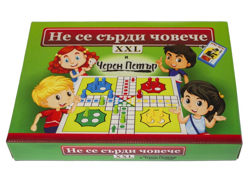 Две класически игри за свободното време на малчуганите - Не се сърди човече и Черен ПетърСъдържа: картонено игрално поле, 16 пионки, зарче и 25 карти за Черен Петър.